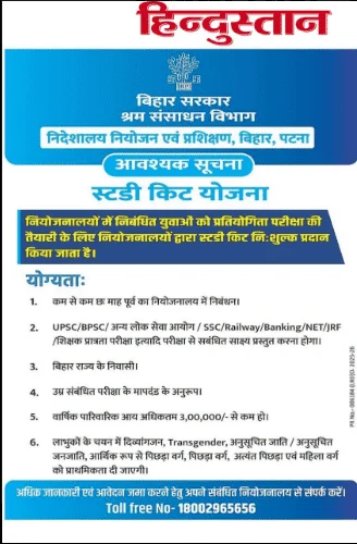 आप सभी को बता दे बिहार सरकार इस योजना के अंतर्गत सभी प्रतियोगी परीक्षा की तैयारी करने वाले विद्यार्थी को स्टडी किट बिल्कुल निःशुल्क में प्रदान किया जाएगा इस योजना में और भी कई सारे फायदे होने वाले हैं और इस योजना में किसको-किसको किन-किन क्रांतिकारी वाले विद्यार्थी आवेदन करेंगे प्राथमिकता कि विद्यार्थी को दी जाएगी विस्तार पूर्वक इस योजना से संबंधित संपूर्ण जानकारी इस लेख में बताया गया है तो लिए नीचे विस्तार पूर्वक हम जानते हैं।