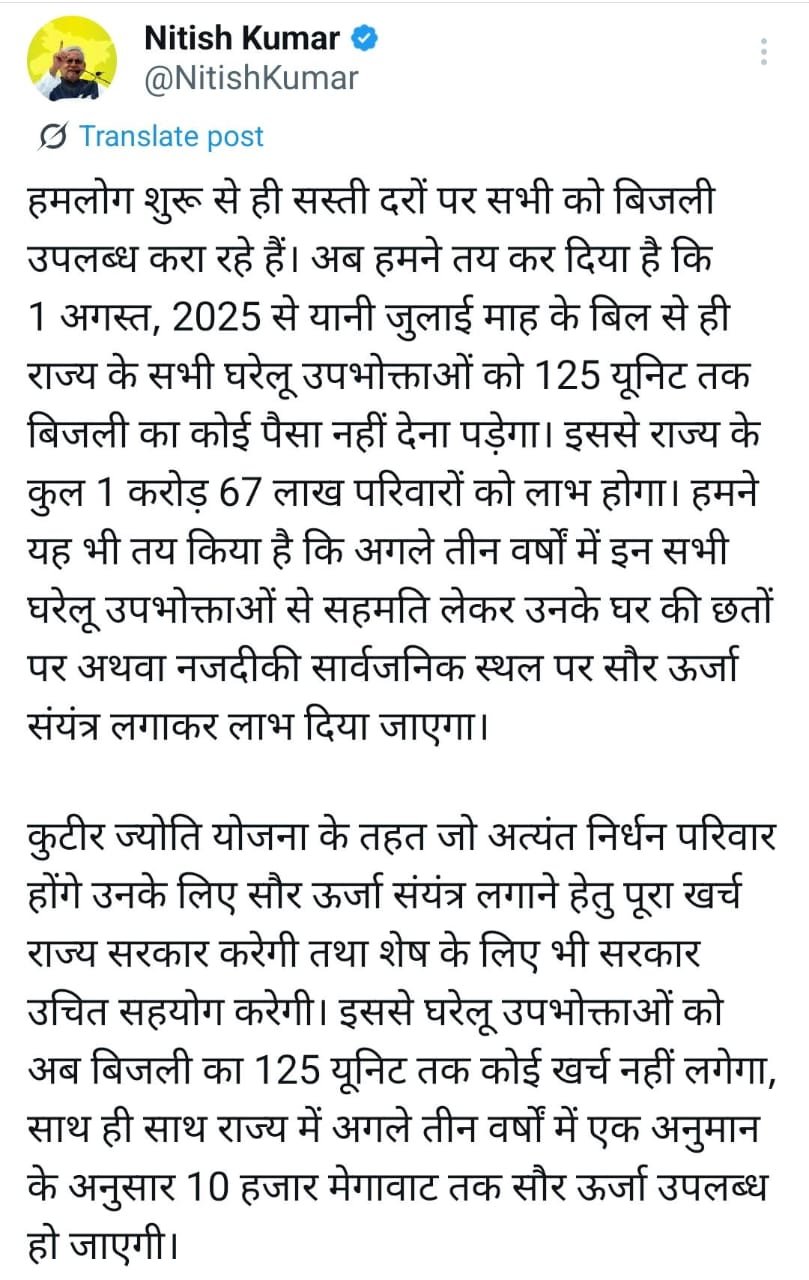 इस योजना के तहत अब बिहार के सभी लोगों को फ्री में 125 यूनिट बिजली मिलेगा इसके बारे में इस लेख में आप सभी को विस्तार पूर्वक बताया गया है तो आप सभी इस लेख को अंत तक पढ़े और इसमें बताई गई जानकारी से यदि आप संतुष्ट हैं तो आप हमें कमेंट बॉक्स में अपना राय जरूर लिखें इसके साथ-साथ इस आर्टिकल को अपने दोस्तों में शेयर करें।