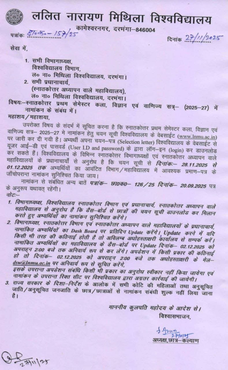 LNMU PG 3rd Merit List 2025 : ललित नारायण मिथिला यूनिवर्सिटी स्नातकोत्तर थर्ड मेरिट लिस्ट 2025-27 डाउनलोड लिंक जारी यहां से चेक करें अपना नाम