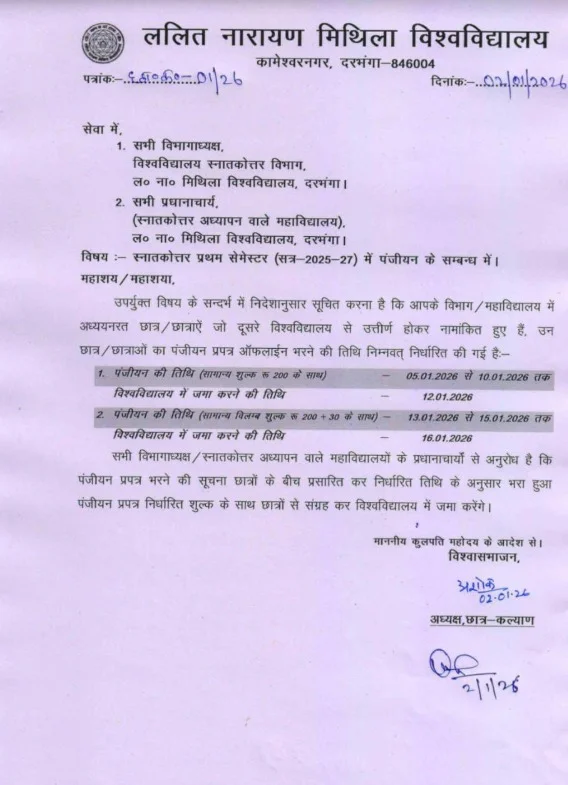LNMU PG Registration 2025-27 : नमस्कार दोस्तों क्या आप ललित नारायण मिथिला विश्वविद्यालय दरभंगा से पोस्ट ग्रेजुएशन करने के लिए एडमिशन लिए हुए हैं तो आप सभी का पंजीकरण के लिए डेट जारी कर दिया गया विश्वविद्यालय के द्वारा आपके लिए काफी अच्छी खबर है पंजीकरण तिथि दिनांक 5 जनवरी 2026 से लेकर 10 जनवरी 2026 तक ऑनलाइन के माध्यम से रखी गई है।