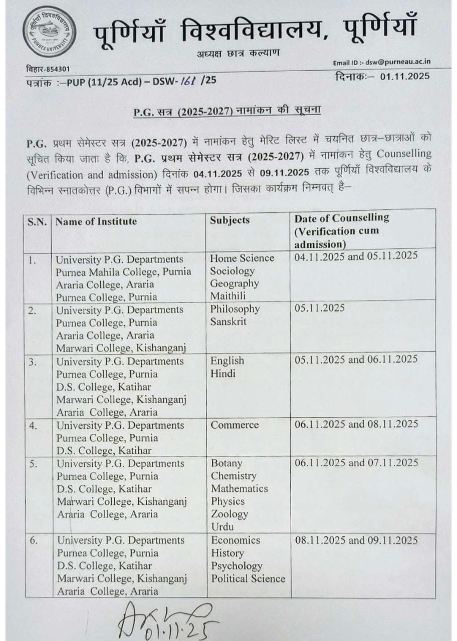 PG 1st Semester 2025-27 में नामांकन हेतु मेरिट लिस्ट में चयनित छात्र-छात्राओं को सूचित किया जाता है कि पीजी फर्स्ट सेमेस्टर सत्र 2025 से 27 में नामांकन हेतु काउंसलिंग (Verification & Admission) दिनांक 4 नवंबर 2025 से 9 नवंबर 2025 तक पूर्णिया विश्वविद्यालय के विभिन्न स्नातकोत्तर (P.G) विभागों में संपन्न होगा जिसका कार्यक्रम निम्न वत नीचे दिए गए हैं।