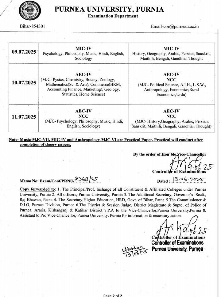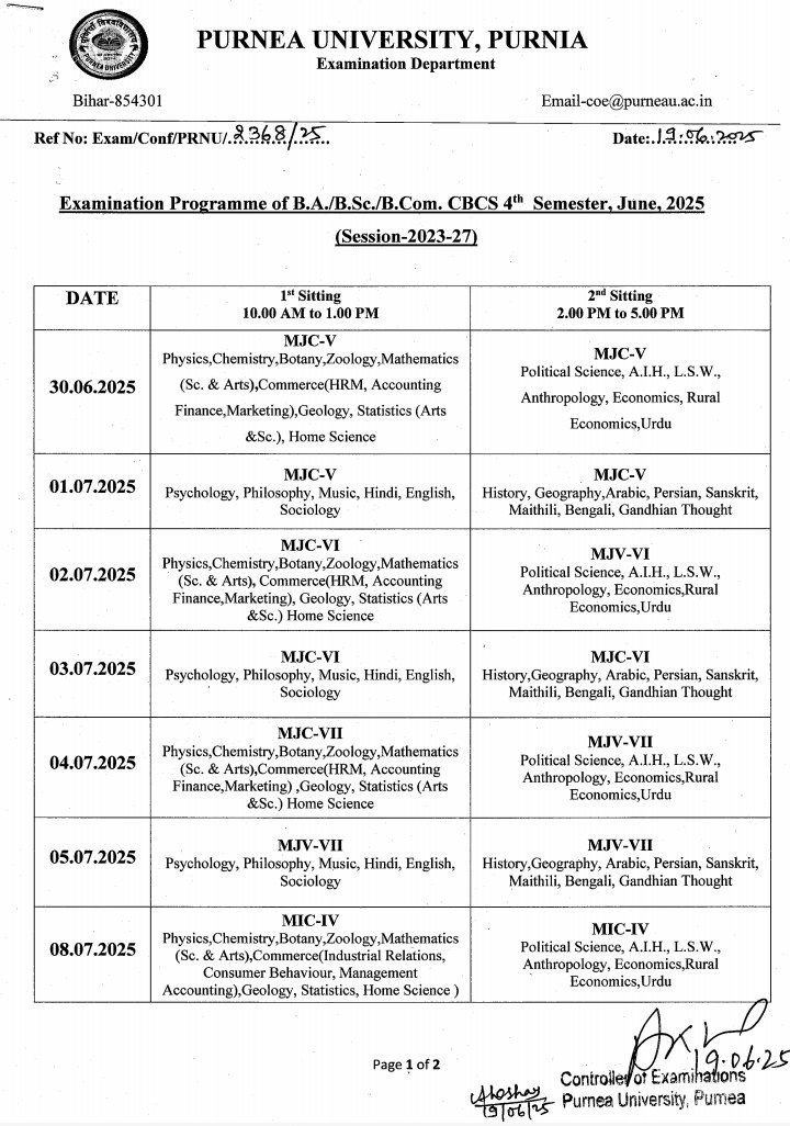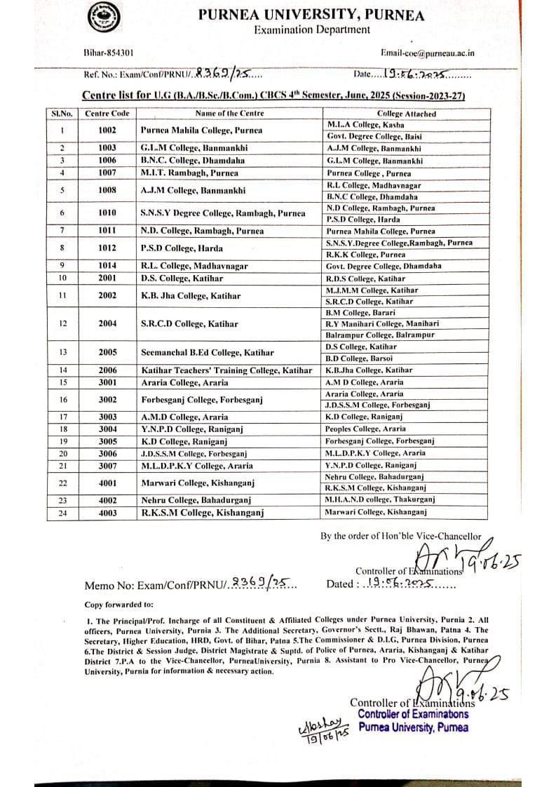 Purnea University UG 4th Semester Exam Date 2025 — पूर्णिया यूनिवर्सिटी ग 4th सेमेस्टर परीक्षा प्रोग्राम और सेंटर लिस्ट हुआ जारी, यहां से देखें