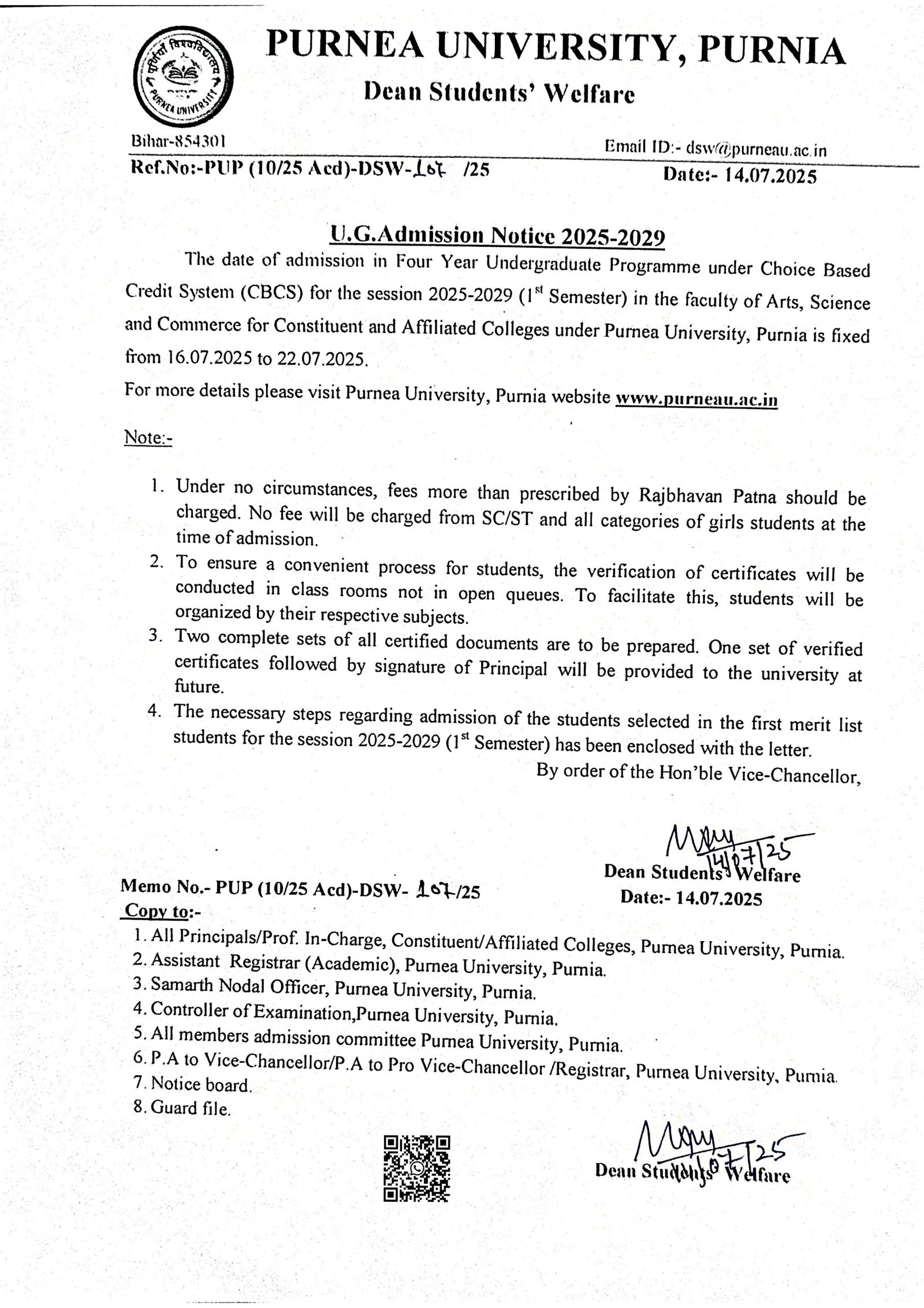 Purnea University UG Admission 1st Merit List 2025 — महत्वपूर्ण तिथियां
